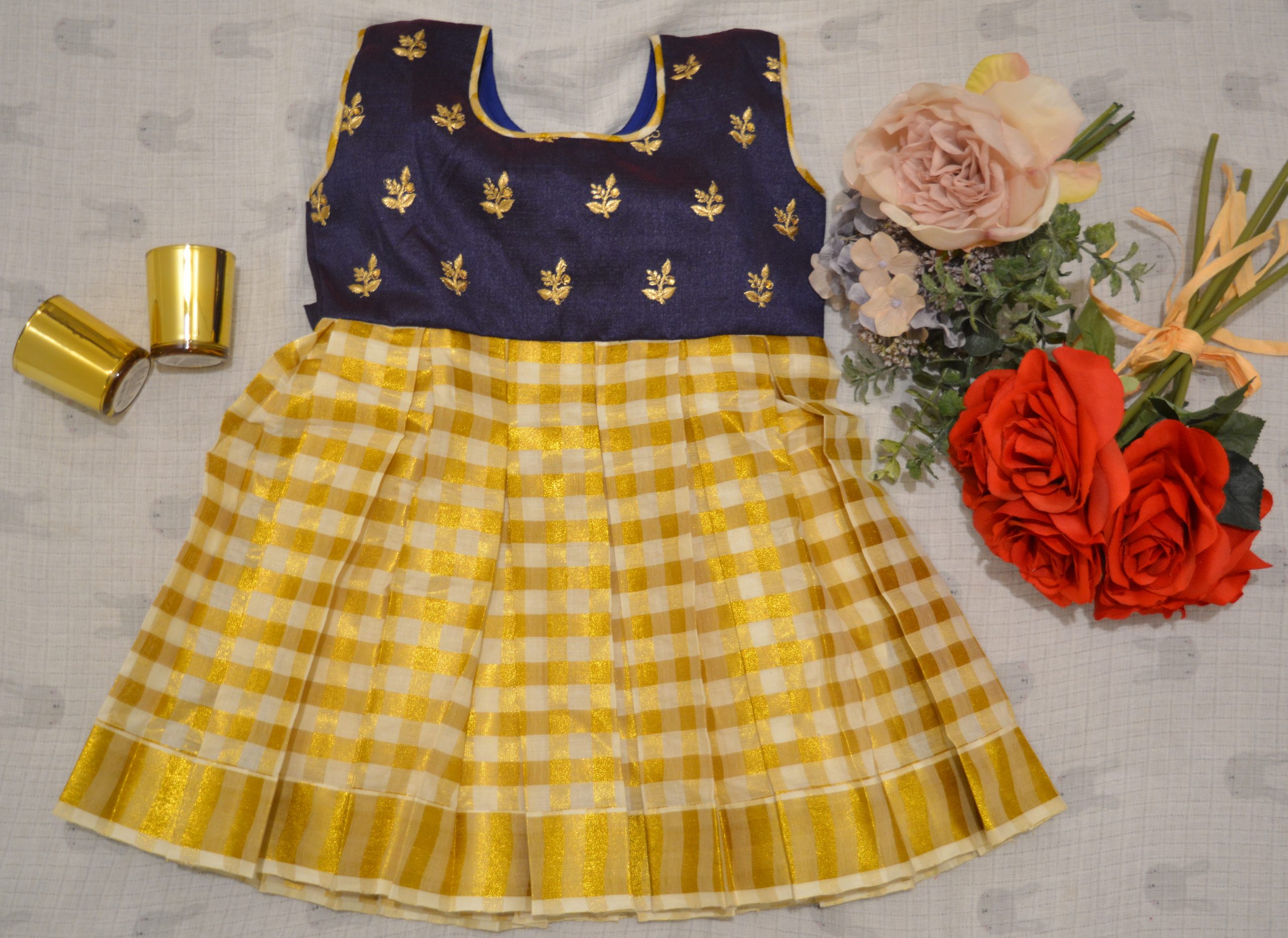 Print/Design – Embroidery Raw silk with round neck with golden checks