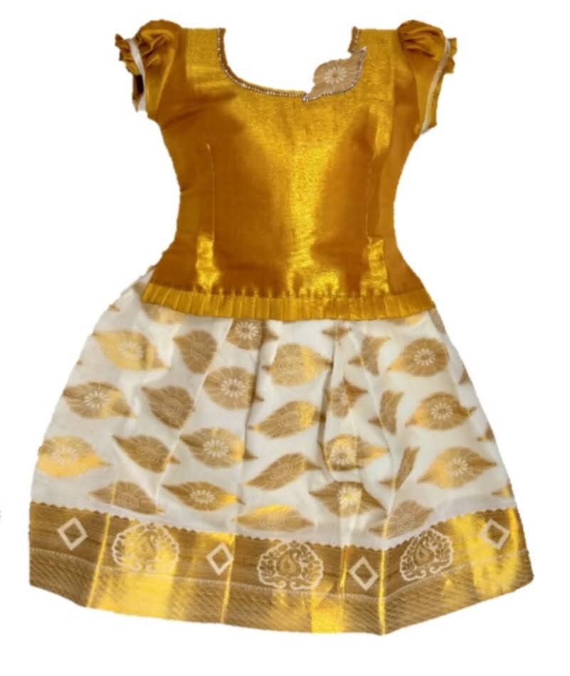 Print/Design – Golden top with patch work around neck and kerala Tissue skirt