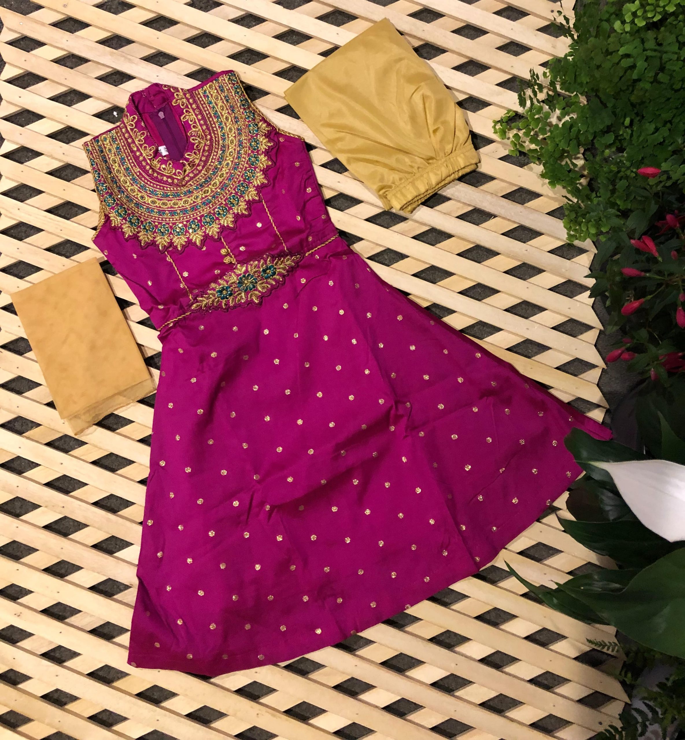 Print/Design – Kurti with Embroidery design for neck and golden butta